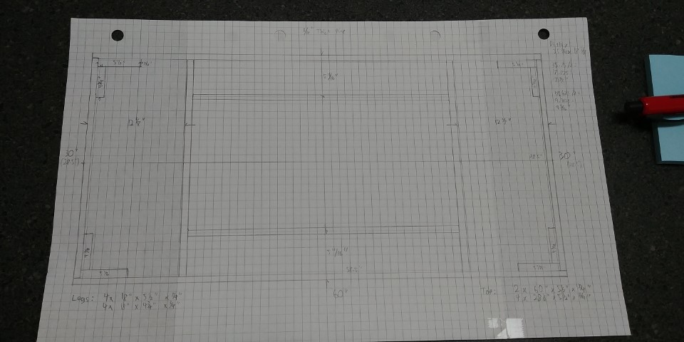 Oh hey we’re back! So a few weeks ago as of this writing, after a successful SparkCON 2017, I decided it was time to finally finish this project. I had ordered the 30” x 60” piece of tempered glass that would be to top of the table, and that giant (heavy!) thing was siting in my workshop staring at me. I dusted off the plans I had drawn up a while back to essentially mimic the demo box above, but with added bits to turn it into a full-sized coffee table with legs and such.