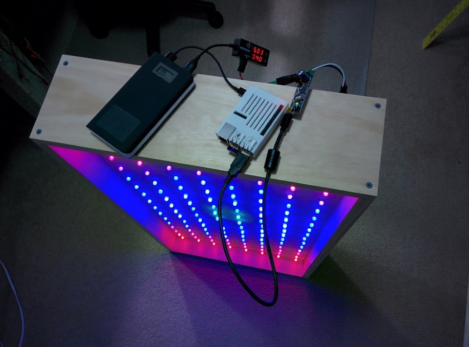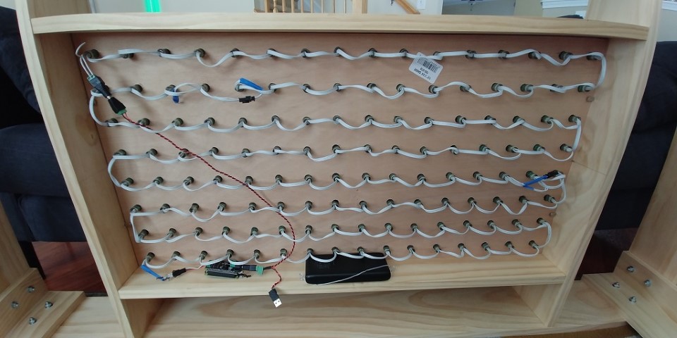 Now given my nature, I wanted to play with the awesome blinky lights part of this project first. So I mocked up a version of the 8x16 display part of the table using some plywood and 3⁄4” x 6” pine board. I also wanted to use this as a way to verify that running the Raspberry Pi and the WS2812 LEDs off the same battery pack would provide at least a few hours of runtime. Everything seemed to be working OK at this point…