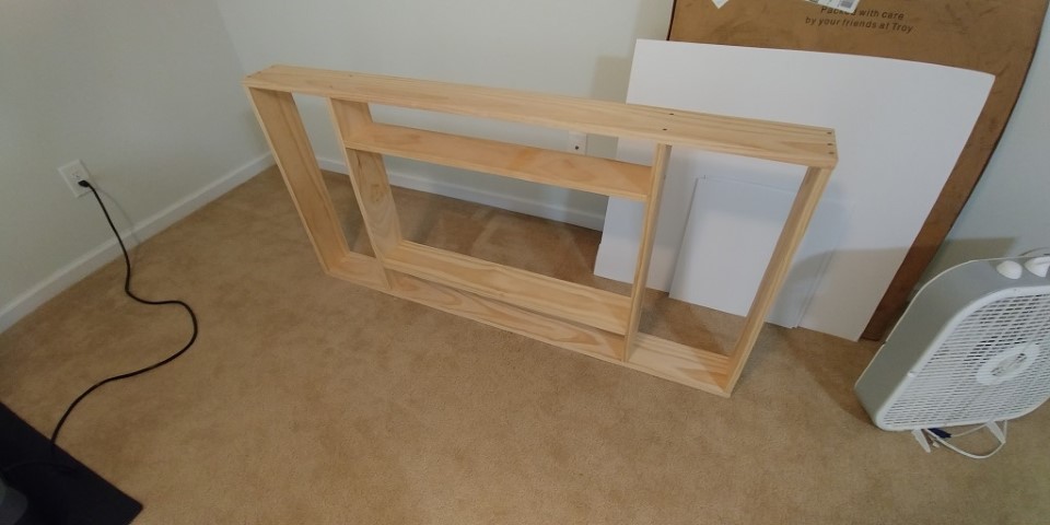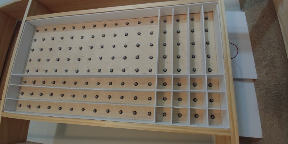 The exact dimensions differ slightly from my original plans. There were some errors made between drawing up those plans and final assembly. This was possibly due to using the same piece of plywood with the holes drilled in it for the final table as was used in the demo box. Regardless, everything came together alright. Next time I build one of these, I’ll remember to counter-sink the drill holes before screwing everything together ;) The display board itself is held in place using shelf pins. Pro Tip: there’s about an eighth of an inch of play to the shelf in the up/down direction depending on how you rotate the pins. This actually helped save me some time when I realized I had cut some of the foam dividers a bit too tall >_<