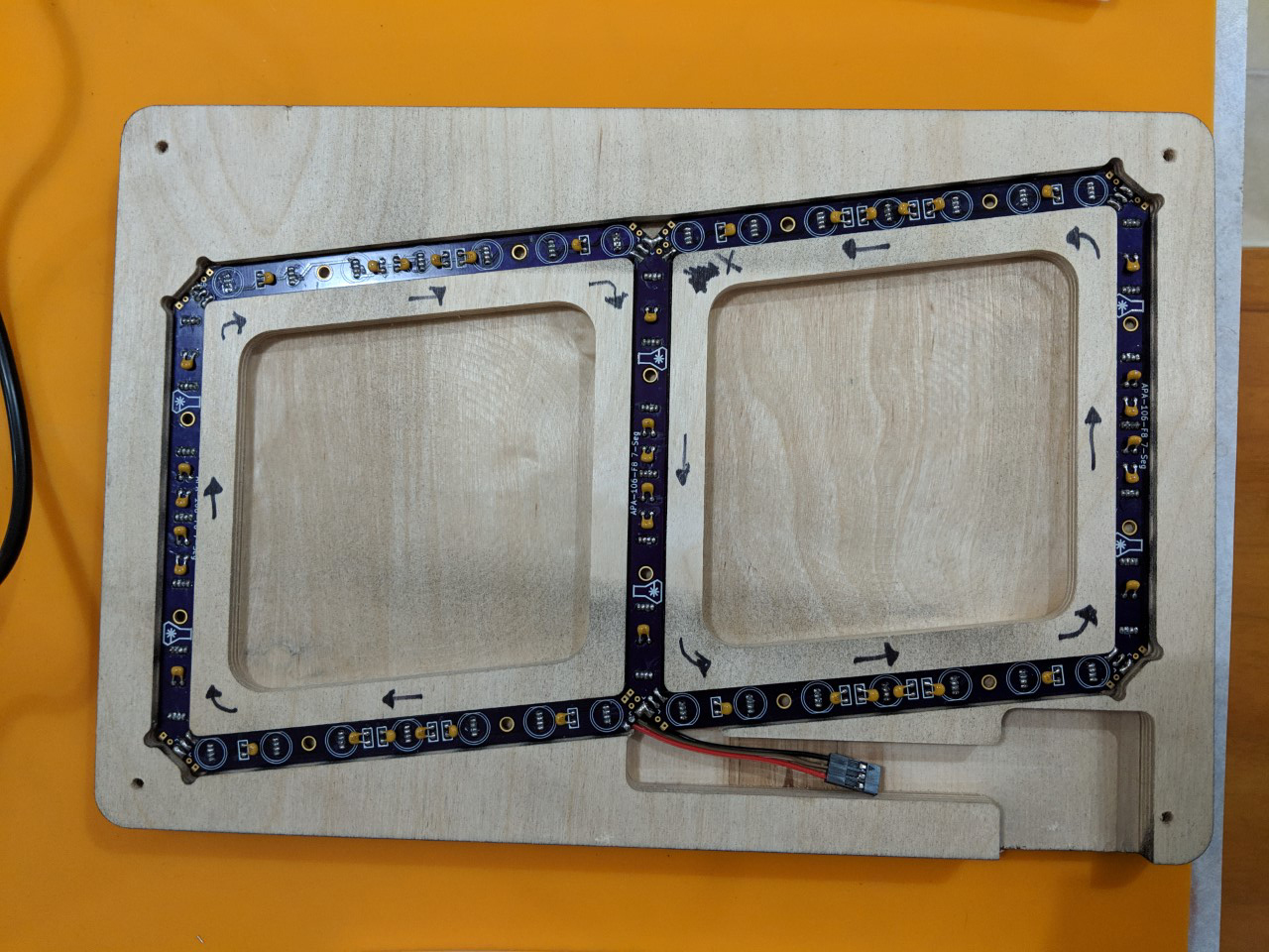 Above I show two segments installed and ready to be soldered. At this point, however, I realized I needed to be extra careful about the direction of the dataflow and, as you can see, added some annotation to the frame to make sure I didn’t forget.