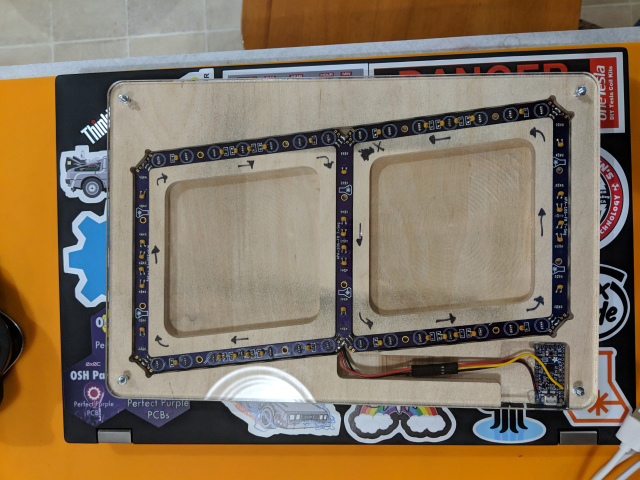 Last but not least it all got topped off (well, “backed off” in this case) with a laser cut, clear acrylic back panel to protect everything while letting it all be seen. While this is primarily a prototype for the final display, Dan and I are going to be at the inaugural KiCon this weekend (Apr 26 & 27, 2019) and I’ve got to have something fun to show off! So being able to see those perfect purple PCBs was of course high priority ;)