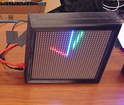 1k Display - Featuring a 32x32 RGB LED panel, the 1k Display is RasPi controlled and housed in a custom-3D-printed case with a partially opaque cover to ‘soften’ the LEDs. Animations, GIF image display, and networked control are made possible by our BiblioPixel Python library.