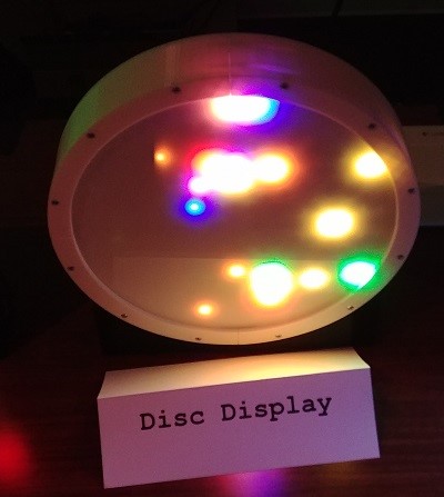 Disc Display - Square displays are neat, but what about circles! This display features the Adafruit Dotstar RGB LED Disc, also in a custom-printed case, with a frosted white diffuser on top. The 255 APA102 LEDs can put out some serious color, and are controlled by our BiblioPixel Python library.