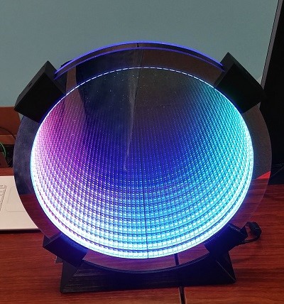 Infinity Mirror - Another circular display, but with a twist. The ‘infinity mirror’ concept relies on a series of lights sandwiched between a full mirror on the back and a partial mirror on the front. Our version uses a strip of 144 LED/meter RGB LEDs, a custom-printed case, and a RasPi running our BiblioPixel Python library.