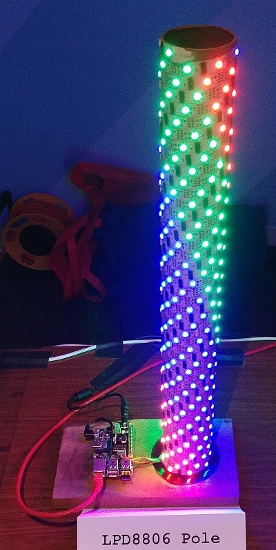 LPD8806 Pole - What happens when you have leftover RGD LED strips and you find a cardboard mailing tube? You make an Art! This ‘display’ uses 10 meters of LPD8806 LEDs and a RasPi with our PiPixel HAT for easy LED hook-up and powering.