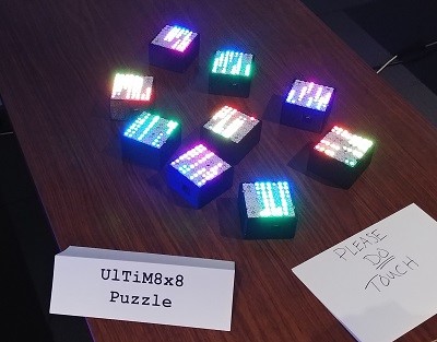 UlTiM8x8 Puzzle - The UlTim8x8 modular LED panel is a collaboration between WyoLum and Maniacal Labs. This tiny 8x8 RGB LED display is featured in this project as the face of each puzzle ‘piece.’ An Adafruit Feather HUZZAH with the ESP8266 module is used for for wireless control and battery power/charging.